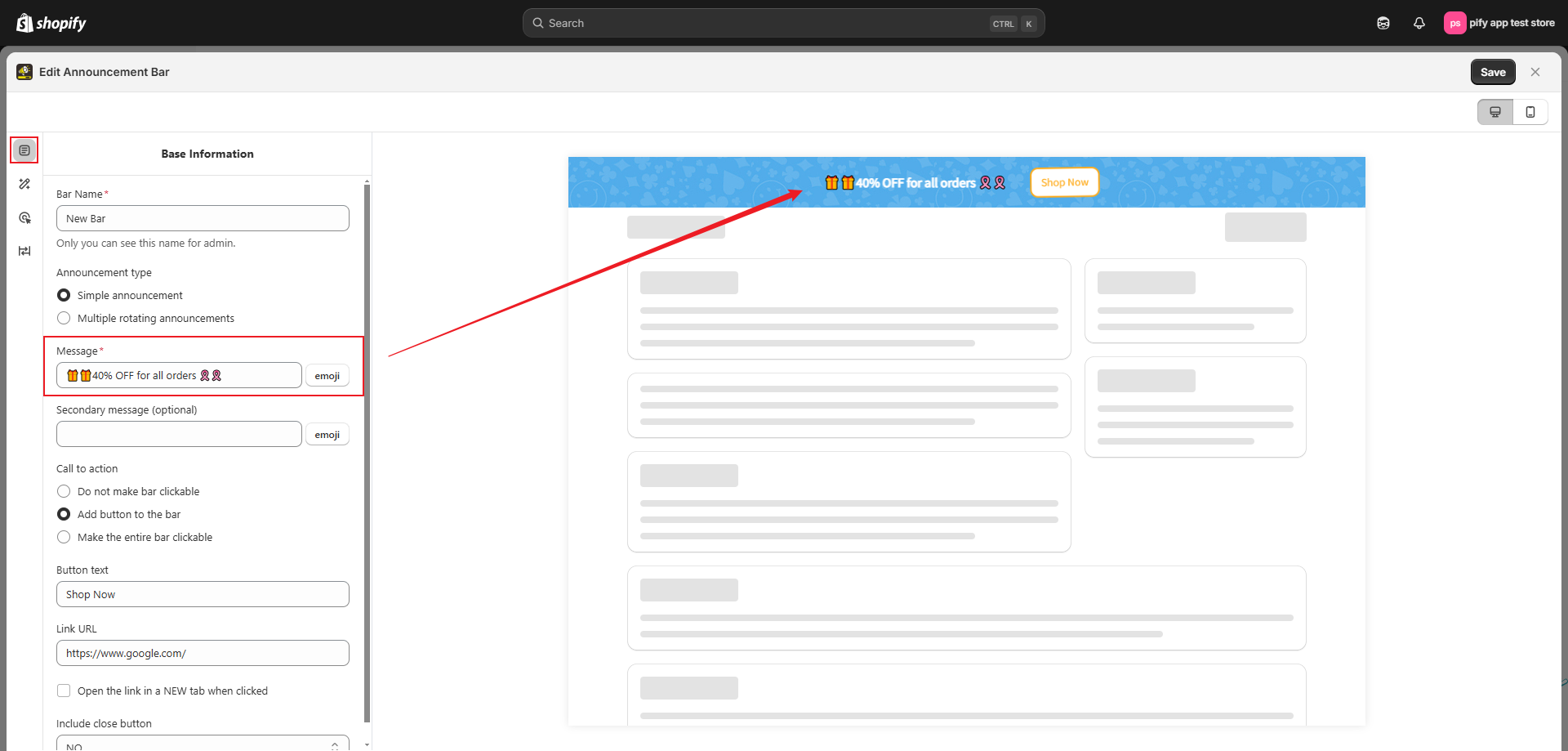 Step1:Please Enable and Save Pify Annoucement App on your theme editor to make it start to work.